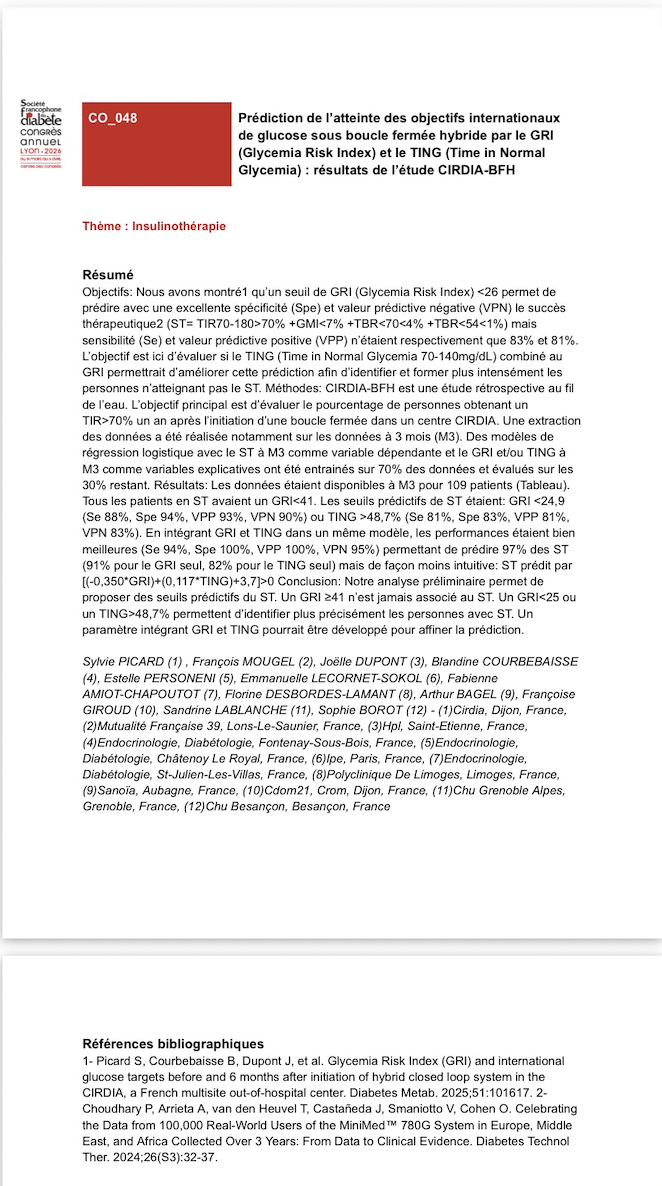 - Article publié dans Diabetes & Metabolism en mars 2025 : Picard S, Courbebaisse B, Dupont J, Amiot-Chapoutot F, Lecornet-Sokol E, Personeni E, Mougel F, Bouché C, Giroud F, Lablanche S, Borot S. Glycemia Risk Index (GRI) and international glucose targets before and 6 months after initiation of hybrid closed loop system in the CIRDIA, a French multisite out-of-hospital center. Diabetes Metab. 2025 Feb 6;51(2):101617. doi: 10.1016/j.diabet.2025.101617.