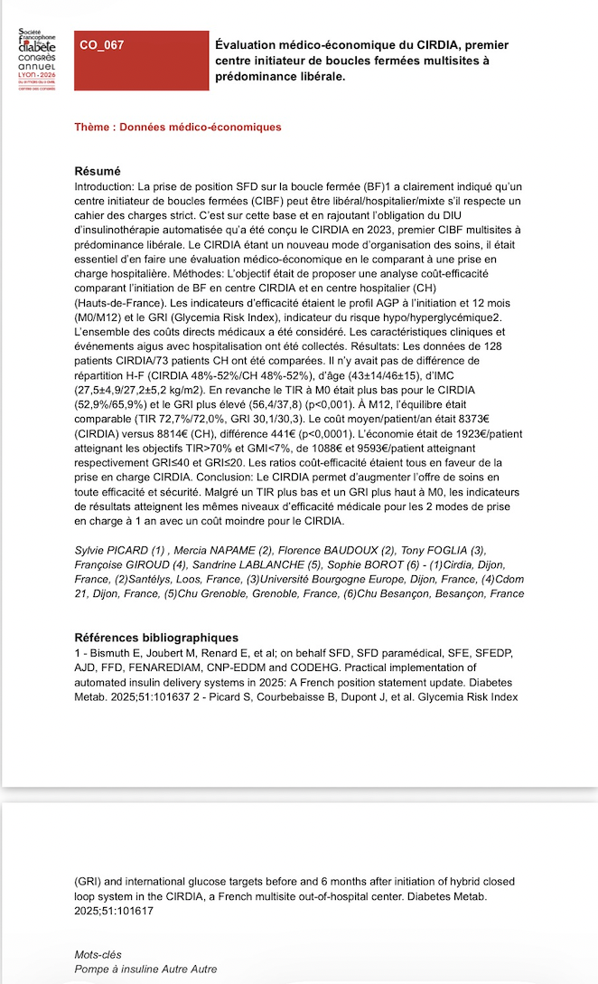 - Article sur l’évaluation médico-économique du CIRDIA sous presse dans JMIR Diabetes : Napame M, Picard S, Foglia T, Rubenstrunk A, Baudoux F, Giroud F, Lablanche S, Borot S. Inter-Regional Center for Automated Insulin in Diabetes (CIRDIA) and Hospital-based Approaches to Closed-Loop Therapy in Type 1 Diabetes: A Cost-Effectiveness Analysis. JMIR Diabetes. 2026 doi: 10.2196/86690